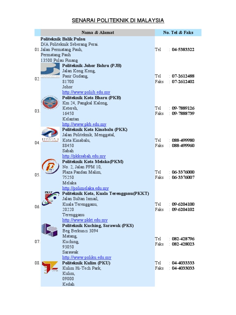 Part 2 - Senarai Politeknik di Malaysia kenalipoliteknik fyp fypシ fypage fyppppppppppppppppppppppp psas politekniksultanazlanshah gemilangpsas welovepolycc muallim perak politeknikmalaysia menangbersama. Senarai politeknik dan alamat di malaysia beserta kursus yang ditawarkan. Untuk makluman anda terdapat 33 buah Politeknik di seluruh Malaysia yang terdiri daripada TIGA jenis politeknik di Malaysia iaitu Politeknik Premier Politeknik Konvensional dan Politeknik METRO.